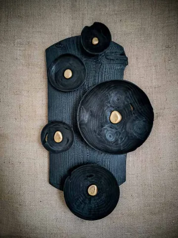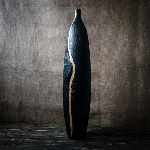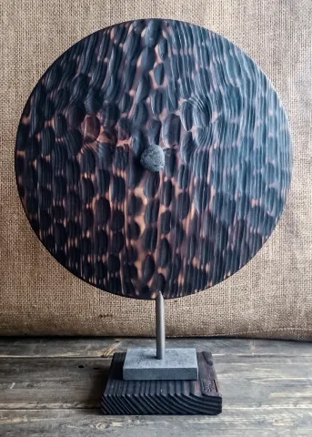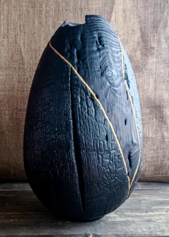Le yakisugi, dans mon approche, n’est ni décoratif ni fonctionnel : il est artistique. Le feu me permet de souligner certaines courbes, de renforcer les contrastes, de créer des textures qui vibrent à la lumière. Parfois, je laisse le bois se fissurer, se tordre, résister. D’autres fois, je le brosse longuement, je le polis, je le traite avec une finition naturelle pour qu’il devienne presque minéral. Et dans certains cas, j’y ajoute de la dorure à la feuille, comme un dialogue silencieux entre ombre et lumière, entre matière brûlée et éclat précieux.