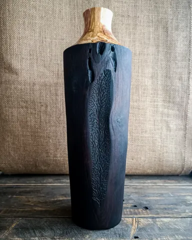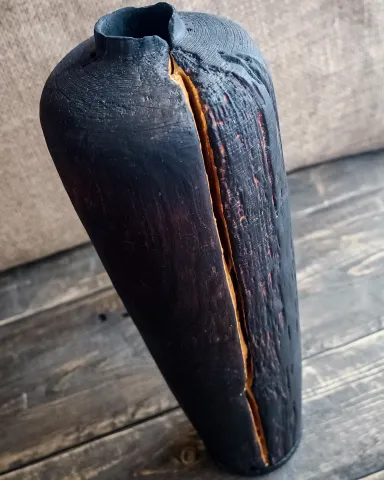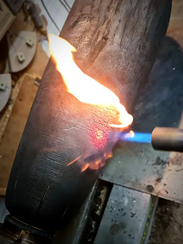 En tant que tourneur sur bois, je pars toujours d’un bloc de matière brute. Je façonne la forme à la main, au tour, dans une recherche d’équilibre, de simplicité, de tension. Chaque essence de bois, chaque veinure, chaque noeud raconte déjà une histoire. Ensuite, j’introduis le feu — pas pour protéger, mais pour révéler.